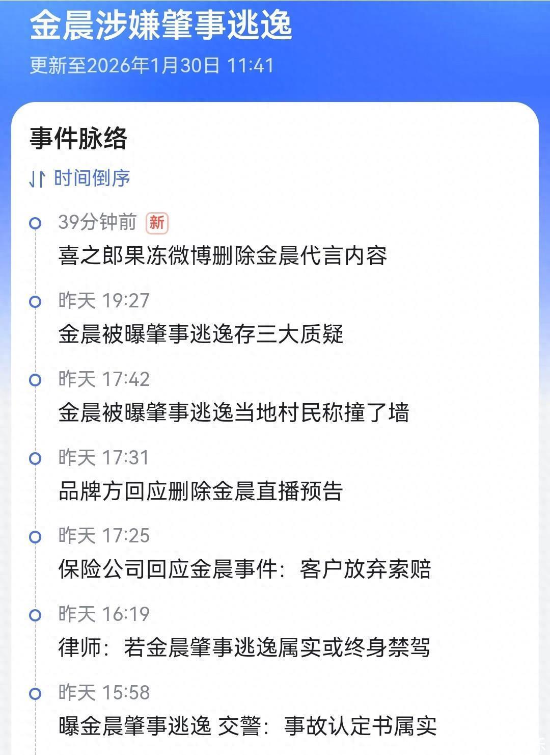 - 云米:第一个解约,从热搜爆出到发声明,只用𱄽小时- 久久丫、君乐宝、桂格燕麦:紧随其后,当天全部切割- 欧莱雅:连夜撤下所有广告牌,连官网都找不到邓伦的名字最戏剧性的是:邓伦的待播剧《夜旅人》,投亿,拍了整个月。因为他的塌房,至今无法播出。制片方损失惨重,但没人敢说"等一等"——因为资本等不起,观众更不会等。邓伦的案例最让人唏嘘:他不是因为性侵、吸毒这种"恶性犯罪",只是偷税漏税——但品牌方依然跑得比谁都快。为什么?因为税务问题,是商业合作里最敏感的雷区。品牌方可以容忍艺人脾气差、耍大牌,但绝对不能容忍"违法"——尤其是涉及金钱的违法。真相:在商业世界里,违法就是原罪,没有轻重之分。三、金晨事件:为什么这次品牌撤得更快?回到金晨事件。为什小时都等不了?为什么其他品牌也纷纷"装死"?因为金晨踩的雷,比前面几个更致命。致命点一:肇事逃逸+顶包,触碰法律红线如果只是普通交通事故,品牌方或许还会观望。但"肇事逃逸+找人顶包",已经涉嫌刑事犯罪(如果造成严重后果,可能构成交通肇事罪)。更可怕的是"顶包"行为——这已经不是简单的交通违法,而是妨害司法公正。在司法实践中,顶包者和被顶包者都可能构成犯罪。品牌方最怕的就是"刑事犯罪"。因为一旦艺人涉及刑事案件,品牌形象会直接和"罪犯"挂钩——这是任何公关都洗不白的污点。致命点二:骗保嫌疑,涉及商业诚信更让品牌方害怕的是"涉嫌骗保"。骗保是什么?是欺诈,是商业诚信的崩塌。一个代言人,如果连最基本的诚信都没有,品牌怎么敢把产品交给她推广?想象一下:消费者买的是"信任"。如果代言人自己都在骗保,消费者会怎么想?"这个品牌找骗子代言,产品能信吗?"商业诚信,是品牌的生命线。 金晨踩的这条线,比任何道德问题都更致命。致命点三:时间差效应——品牌已经"学聪明了"还有一个容易被忽略的原因:品牌方已经吃过亏了。从吴亦凡到李易峰,从邓伦到张继科——每一次明星塌房,都有品牌因为"反应慢"被骂上热搜。现在的品牌公关,已经形成了一套"条件反射":- 看到"法律风险"关键词→立即启动应急预案- 看到"警方介入"→直接判定为高风险- 看到"顶流塌房"→不等官方通报,先撤物料保平安为什么跑得这么快?因为她们知道:第一个解约的,是"正义使者";最后一个解约的,是"包庇罪犯"。在舆论场里,速度就是态度,态度就是立场。结尾:那个让所有艺人害怕的真相写到这里,我想起一个资深经纪人的话:"现在的艺人,睡觉都要睁着一只眼。因为你永远不知道,明天醒来会不会因为十年前的一件事,毁掉整个职业生涯。"这句话听起来夸张,但金晨事件就是最好的证明——2025月的事,2026月才被爆出来。一年的时间差,足够让一个艺人从顶流跌入谷底。所以,我想对所有艺人说三句话:第一,法律红线,碰不得。 你以为只是小事,但在品牌方眼里,违法就是原罪。酒驾、逃税、肇事逃逸——任何一条,都足以让你万劫不复。第二,商业诚信,丢不得。 骗保、造假、虚假宣传——这些行为毁掉的不仅是你的形象,更是品牌对你的信任。而信任一旦崩塌,重建需要十年。第三,公众人物的责任,逃不得。 你享受了聚光灯下的荣耀,就要承担聚光灯下的监督。你的每一个行为,都会被放大、被审视、被审判。
